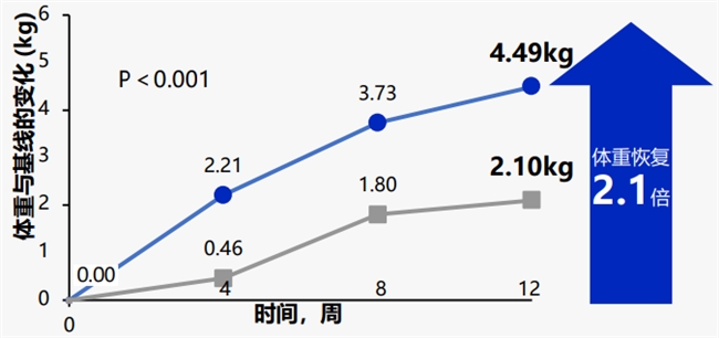 3.治疗疗效更强:临床数据显示,用药12周后,患者平均体重增加4.49kg,是普通甲地孕酮分散片的2.1倍[5]。